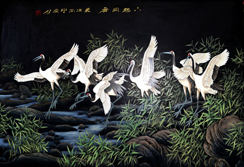 為使代縣推光漆器這一傳統(tǒng)技藝得以傳承并發(fā)揚(yáng)光大,代縣華亭環(huán)藝雕塑有限責(zé)任公司將過去在代縣木器廠中工作過的畫工、漆匠招至麾下,專門研發(fā)、生產(chǎn)高檔推光漆畫。用質(zhì)地細(xì)密的高檔板材做畫板,經(jīng)過反復(fù)刮泥,精心打磨,涂刷大漆,漆后細(xì)磨,磨后再漆,漆后再磨,反復(fù)數(shù)遍,然后用手掌推擦出光澤,再經(jīng)多種工藝,描金彩繪,包括平金開黑、堆鼓罩漆、勾金、罩金等傳統(tǒng)技法,繪飾出山水花鳥、亭臺(tái)樓閣或人物故事,之后再上三道大漆,分別用砂紙、木炭、頭發(fā)、磚灰、麻油等逐次推光,使漆面光亮如鏡。這種高檔漆畫多以墨黑、霞紅、杏黃、綠紫為主,上面繪以具有民族風(fēng)格的圖案,如花鳥魚獸、山水風(fēng)光、亭臺(tái)樓閣、吉祥圖案,或古典小說、戲劇和古代神話傳說中的故事人物等等,或描金彩繪,或刀刻雕墊,或堆鼓鑲嵌,線條流暢,古樸典雅、色調(diào)和諧,富麗堂皇,成為裝飾居室的高檔工藝品。每件少則數(shù)千元,多則上萬元,深受消費(fèi)者的青睞。去年9月參加全省第二屆文化產(chǎn)業(yè)博覽會(huì),其選送的推光漆畫《雁門關(guān)》還獲得了銀獎(jiǎng)。
