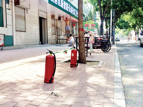 8月6日,記者在途經(jīng)忻府區(qū)忻中北巷時(shí),發(fā)現(xiàn)路南側(cè)便道上豎著兩個(gè)別樣的“路樁(滅火器)”:用一根繩子將兩端連著。這種可以“收取自如”的簡(jiǎn)易“路樁”是附近商店為了防止車輛亂停亂放而設(shè)置的。殊不知商戶如此“另辟蹊徑”的用法,不僅侵占了人行道,也極易因滅火器被碰撞而發(fā)生危險(xiǎn),存在極大的安全隱患。希望相關(guān)部門(mén)及商戶能夠引起重視,“物歸原地”,“物”用其能。(實(shí)習(xí)記者 王君 高君)