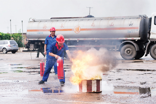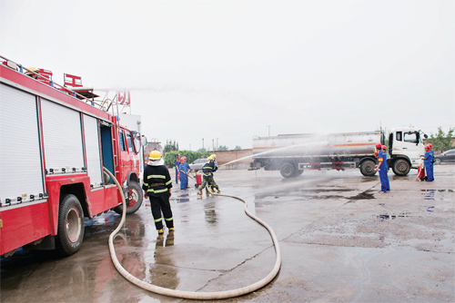 首先上場(chǎng)的是泉鑫石油運(yùn)輸有限公司,他們演練的科目是汽柴油滅火救援。其一是假定油罐車在缷油時(shí)發(fā)生燃燒事故,接到報(bào)警后,消防車迅速趕到現(xiàn)場(chǎng),連接好水槍做好滅火準(zhǔn)備;應(yīng)急搶險(xiǎn)隊(duì)、車輛搶救隊(duì)、后勤保障隊(duì)也同時(shí)到達(dá)現(xiàn)場(chǎng),拉起警戒繩,各司其職進(jìn)行應(yīng)急處置,成功將險(xiǎn)情排除并清理現(xiàn)場(chǎng)。其二是油罐車在裝油時(shí)發(fā)生進(jìn)油口著火險(xiǎn)情,各隊(duì)?wèi)?yīng)急救援人馬接到警情急速趕到事發(fā)現(xiàn)場(chǎng),放好三角警示架、拉起警戒繩禁止無關(guān)人員靠近,用消防車水槍對(duì)油罐車車體進(jìn)行冷卻處理,利用干粉滅火和石棉滅火等技法,最終成功處置險(xiǎn)情。