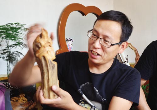 2008年,火苗參觀了在京城舉辦的一次大型美展,偶爾看到根雕大師鄭劍夫的作品,受到了深深的震撼。那仰天問道的老子、憂國憂民的屈原、舉杯邀明月的李白……神態(tài)細膩,形象逼真,惟妙惟肖,讓人緊緊盯著不愿離去。就這樣,火苗萌生了學(xué)習(xí)根雕的念頭。從此時開始,購買工具、收集資料、參觀展覽,根雕在他的心頭扎下了根。