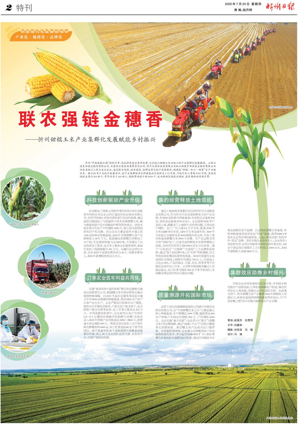 作為“中國雜糧之都”的忻州市,依托特色農(nóng)業(yè)資源優(yōu)勢,已形成以甜糯玉米為核心的產(chǎn)業(yè)集群化發(fā)展格局。山西正道良田農(nóng)業(yè)股份有限公司、定襄維爾康食品有限責(zé)任公司、忻州天綠源食品有限公司和山西康宇田源農(nóng)業(yè)股份有限公司四家省級(jí)以上重點(diǎn)龍頭企業(yè),通過技術(shù)創(chuàng)新、標(biāo)準(zhǔn)建設(shè)、品牌運(yùn)營與農(nóng)戶深度聯(lián)結(jié),構(gòu)建起“種植—加工—銷售”全產(chǎn)業(yè)鏈體系。據(jù)2024年產(chǎn)業(yè)統(tǒng)計(jì)數(shù)據(jù)顯示,該產(chǎn)業(yè)集群標(biāo)準(zhǔn)化種植基地總面積達(dá)1.33萬畝,可統(tǒng)計(jì)加工量超3000萬穗,直接創(chuàng)造就業(yè)崗位500余個(gè),季節(jié)性用工400余人,輻射帶動(dòng)農(nóng)戶超4400戶,成為推動(dòng)區(qū)域農(nóng)業(yè)增效、農(nóng)民增收的重要引擎。