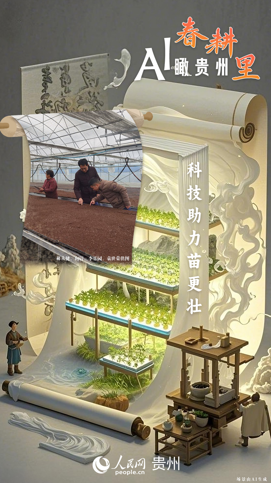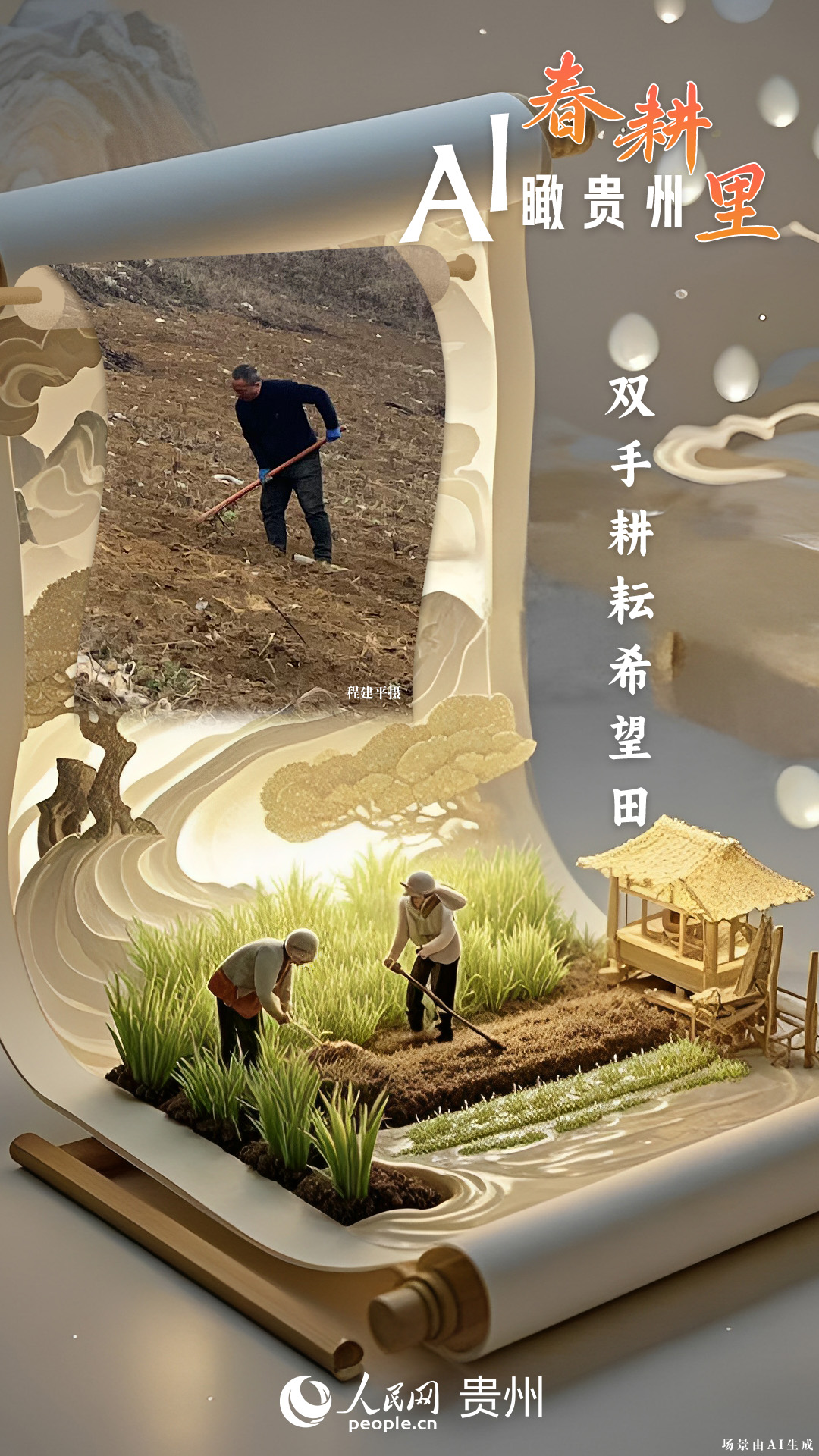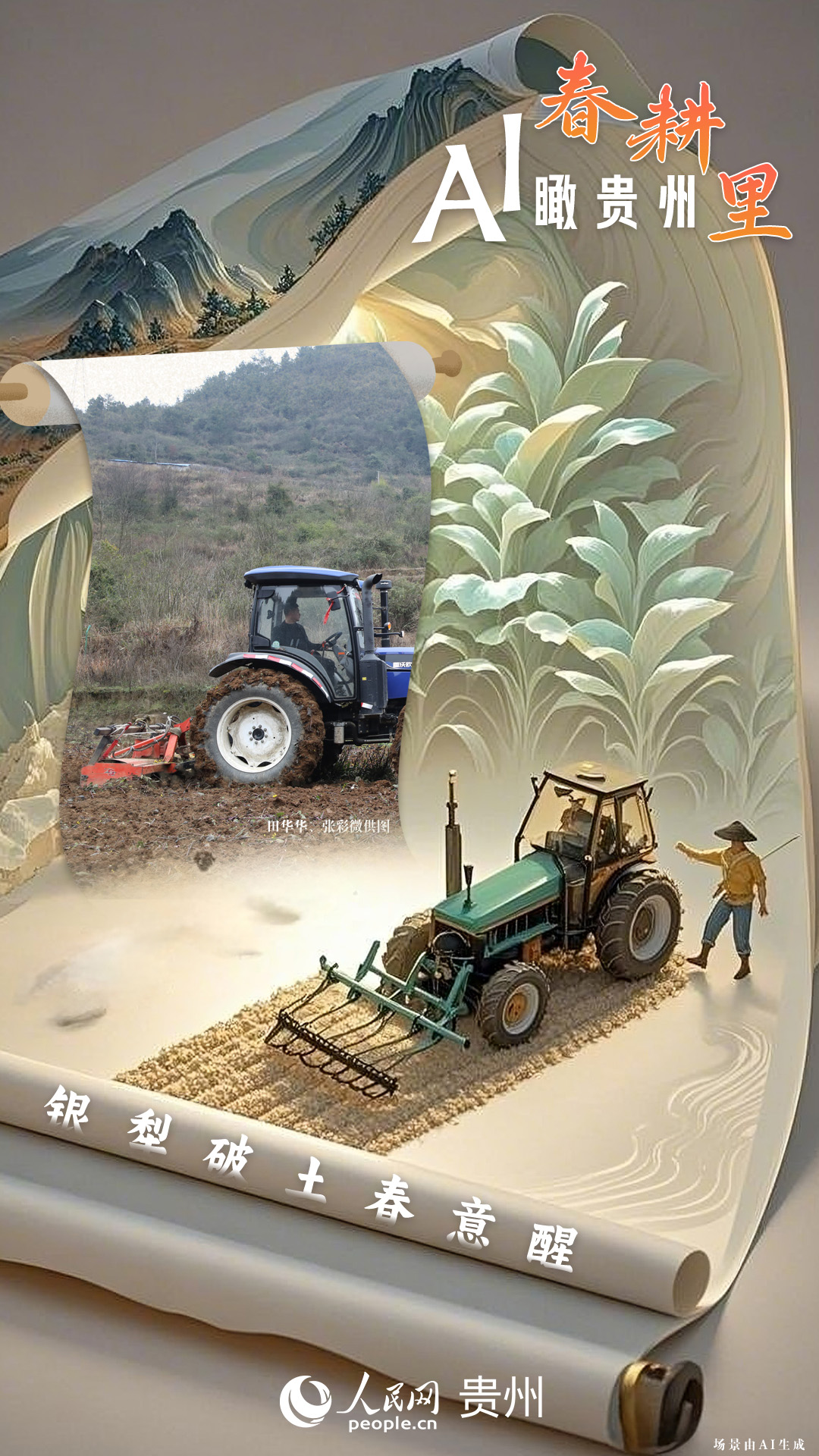 春回大地,萬物復(fù)蘇,黔地山川間正上演著一場(chǎng)生機(jī)勃勃的春耕盛景。傳統(tǒng)農(nóng)耕與現(xiàn)代科技在這里交織,描繪出一幅幅充滿希望的畫卷。 春耕不僅是農(nóng)時(shí)的序曲,更是科技與土地對(duì)話的現(xiàn)場(chǎng)。在貴州這片喀斯特地貌與民族文化交織的土地上,春耕正經(jīng)歷一場(chǎng)靜默的變革:無人機(jī)掠過千年梯田,算法解析紅壤墑情,覆膜機(jī)織就“智能外衣”,而彎腰勞作的農(nóng)人,依然用繭手傳遞著古老農(nóng)耕文明的溫度。 本期跟隨AI一起描繪貴州春耕里的故事。