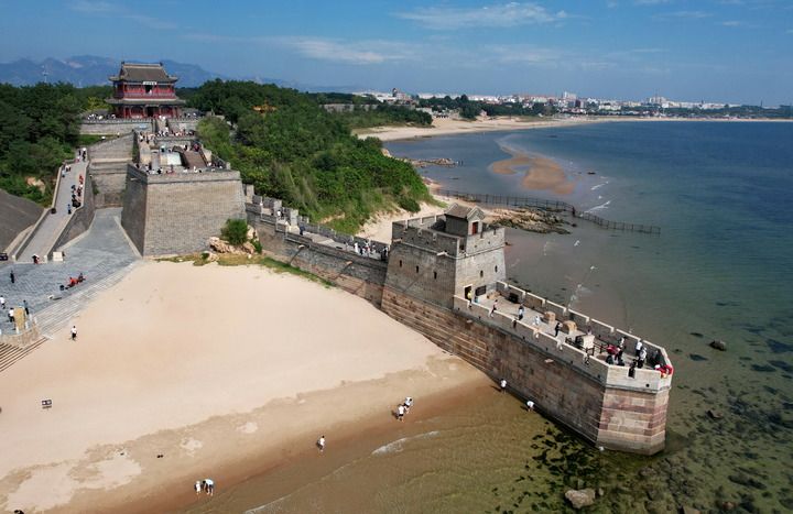 2024年9月19日,游客在秦皇島市山海關(guān)區(qū)老龍頭景區(qū)游覽(無人機照片)。新華社記者 楊世堯 攝