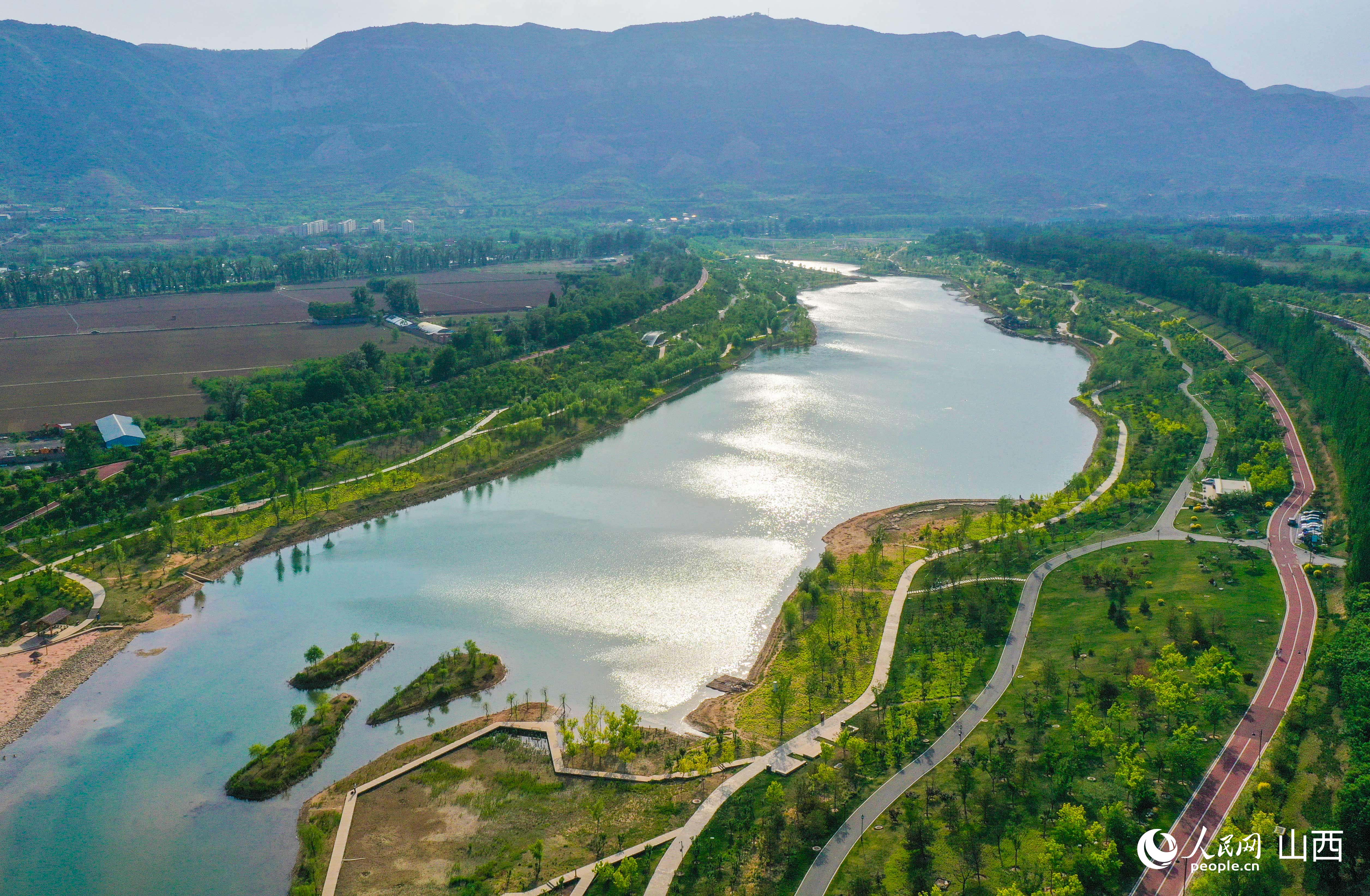 6月22日,俯瞰山西太原汾河四期濕地公園,雁丘園綠意盎然,水面波光粼粼,一派生機(jī)盎然,勾畫出一幅自然和諧的生態(tài)美景。