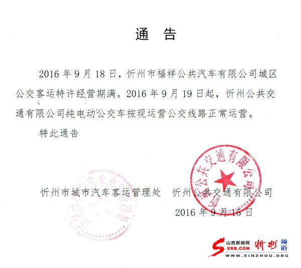 2016年9月18日,忻州市福祥公共汽車有限公司城區(qū)公交客運特許經(jīng)營期滿。2016年9月19日起,忻州公共交通有限公司純電動公交車按現(xiàn)運營公交線路正常運營。