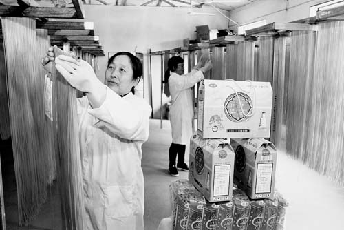 7月20日,工人正在晾曬生產(chǎn)出的“河撈面”。始制于北宋年間的五臺(tái)縣民間美食“河撈面”,如今又被該縣豆村鎮(zhèn)列為產(chǎn)業(yè)扶貧項(xiàng)目。在當(dāng)?shù)兀粋€(gè)由興坪村“霞輝”玉米加工專業(yè)合作社生產(chǎn)出的玉米、高粱、蕎麥、大豆等12類盒裝與袋裝產(chǎn)品,已俏銷太原、忻州等食品市場,年產(chǎn)值達(dá)56萬元。(金俊賢 攝)