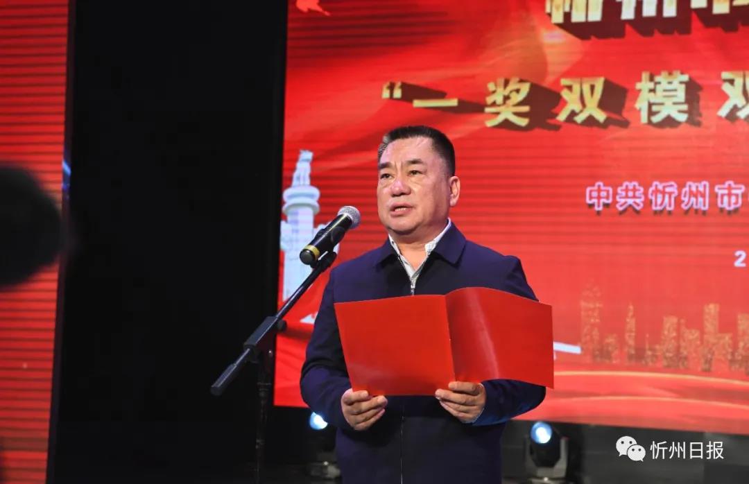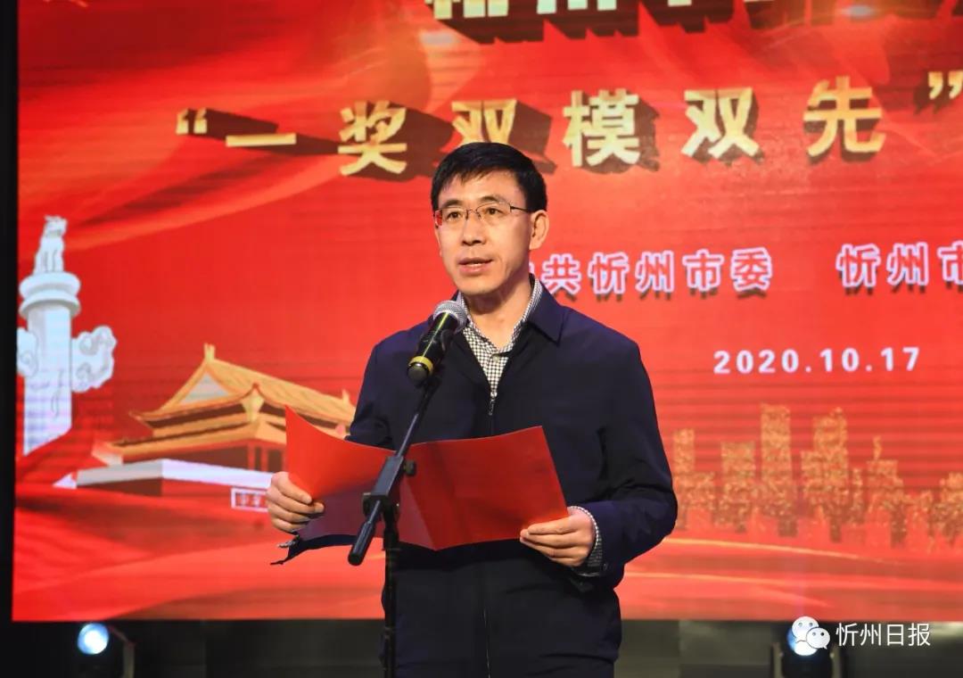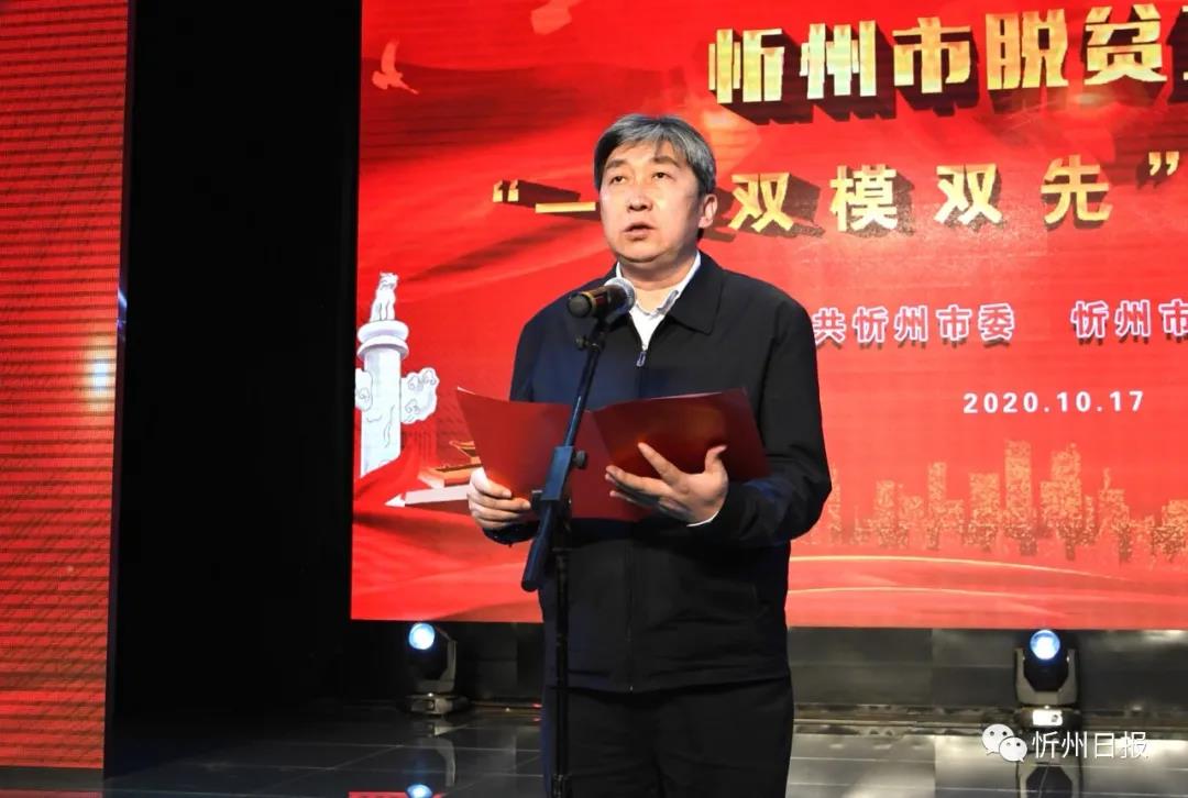 秦書義宣讀《中共忻州市委忻州市人民政府〈關(guān)于表彰2020年忻州市脫貧攻堅“一獎雙模雙先”的決定〉》。劉紀森攝