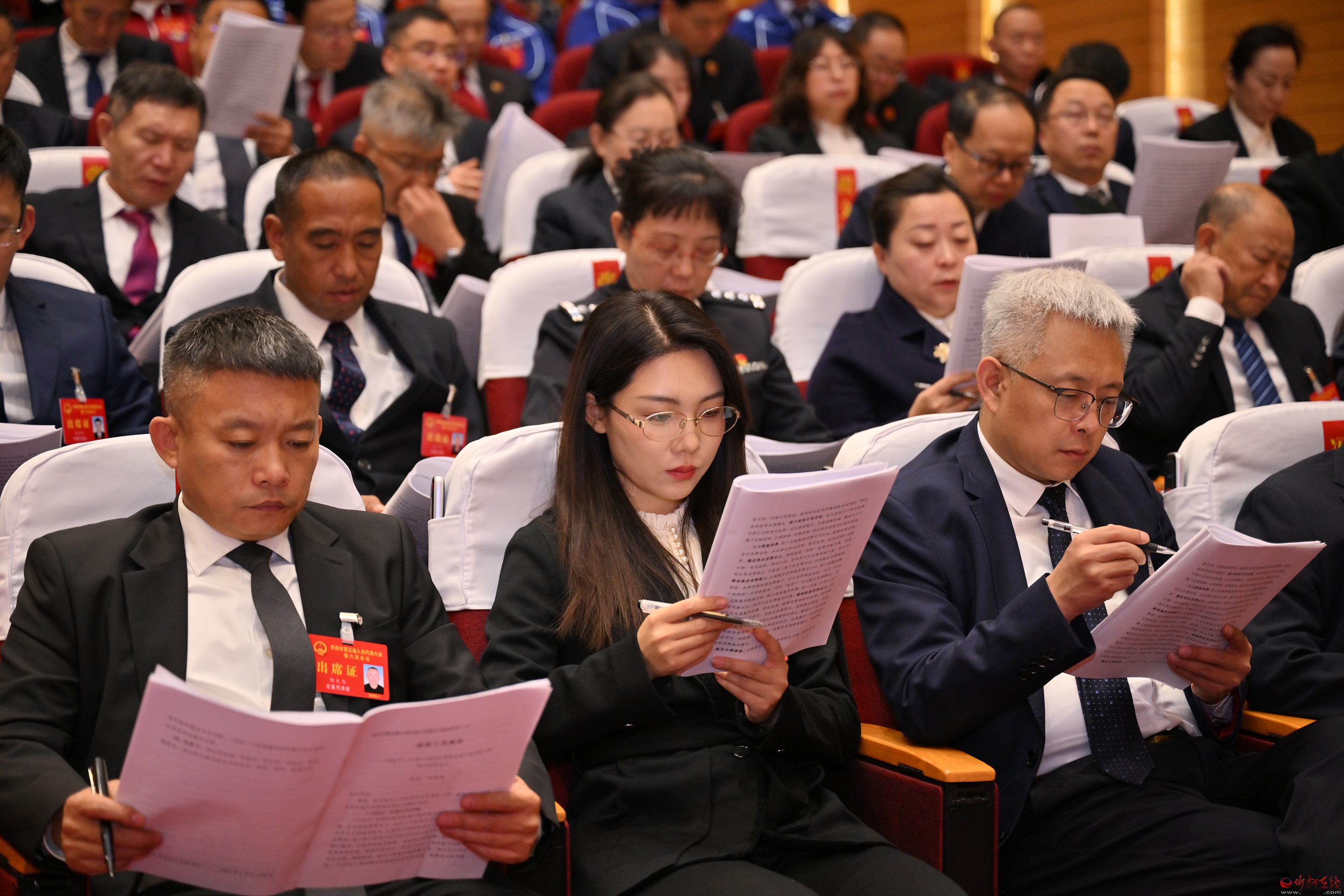 泛華會場內(nèi)簡樸莊嚴(yán),主席臺帷幕正中的國徽在鮮艷的紅旗映襯下熠熠生輝。會場二樓“更加緊密地團(tuán)結(jié)在以習(xí)近平同志為核心的黨中央周圍,奮力譜寫中國式現(xiàn)代化忻州篇章”的標(biāo)語,提振信心、催人奮進(jìn)。