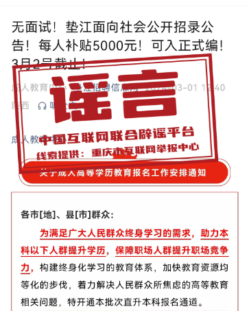 真相:近日,“墊江招聘信息網(wǎng)”微信公眾號發(fā)布信息:“無面試!重慶墊江面向社會公開招錄公告!每人補(bǔ)貼5000元!可入正式編!”部分網(wǎng)民看到該信息后誤認(rèn)為,墊江面向社會以補(bǔ)貼形式招錄具有正式編制的公務(wù)人員,于是紛紛向墊江縣有關(guān)部門致電咨詢招錄情況。經(jīng)核實,近年來,墊江未曾以補(bǔ)貼方式和不經(jīng)過面試招錄具有正式編制公務(wù)人員。該信息實則為成人學(xué)歷提升培訓(xùn)信息,而非正式編制公務(wù)人員招錄信息。墊江縣互聯(lián)網(wǎng)信息辦公室已依法對發(fā)布該信息的微信公眾號負(fù)責(zé)人進(jìn)行約談和教育批評,指出虛假信息的危害性,并責(zé)令刪除相關(guān)信息。(來源:重慶辟謠)
