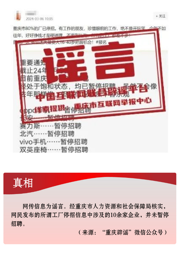 搭蹭熱點散播民生類謠言,渲染焦慮。3月,全國兩會召開,“民生清單”熱度高?!按赫小薄按河巍钡葧r間節(jié)點,有關(guān)招工就業(yè)、疫病傳染等內(nèi)容也成為個別網(wǎng)民博眼球的素材。一些個人或自媒體歪曲甚或虛構(gòu)事實,編造散布社會民生謠言,引發(fā)公眾不必要的焦慮。如,別有用心者惡意虛構(gòu)事實,發(fā)布“重慶80%的工廠暫停招聘”“湖南郴州疫情卷土重來”等虛假信息,渲染負(fù)面情緒、徒增公眾憂慮、擾亂社會秩序;還有人為吸引流量、博取關(guān)注,根據(jù)主觀臆想,采取移花接木等手段,散播“京滬高速公路停止收費”“浙江麗水機場已建成投用并首航”“重慶合川太和飛機場正式開建”等涉重大基礎(chǔ)設(shè)施建設(shè)項目的假消息,誤導(dǎo)公眾認(rèn)知,擾亂群眾交通出行秩序。