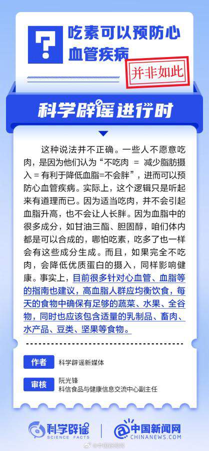 一些人不愿意吃肉,是因?yàn)樗麄冋J(rèn)為“不吃肉=減少脂肪攝入=有利于降低血脂=不會(huì)胖”,進(jìn)而可以預(yù)防心血管疾病。實(shí)際上,這個(gè)邏輯只是聽起來有道理而已。因?yàn)檫m當(dāng)吃肉,并不會(huì)引起血脂升高,也不會(huì)讓人長(zhǎng)胖。如果完全不吃肉,會(huì)降低優(yōu)質(zhì)蛋白的攝入,同樣影響健康。(來源:@科學(xué)辟謠 中國(guó)新聞網(wǎng)微博)