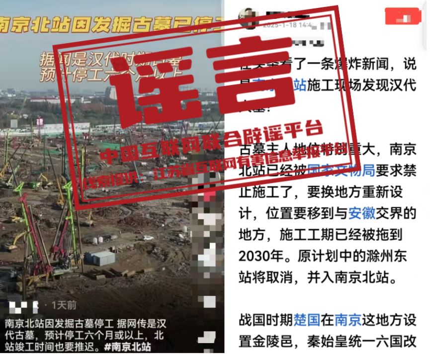 真相:近日,有網(wǎng)民在網(wǎng)絡(luò)平臺發(fā)帖稱,南京北站因挖到古墓,“已經(jīng)被國家文物局要求禁止施工了”“預計停工六個月或以上”“施工工期已經(jīng)被拖到2030年”等。經(jīng)江蘇省互聯(lián)網(wǎng)辟謠平臺與省文物部門和屬地核實,目前沒有收到國家文物局關(guān)于“南京北站禁止施工”的有關(guān)通知,南京北站除個別涉及考古發(fā)掘作業(yè)區(qū)域外,其他施工作業(yè)均按計劃正常有序推進,網(wǎng)傳信息系謠言。(來源:江蘇省互聯(lián)網(wǎng)辟謠平臺、“南京網(wǎng)絡(luò)辟謠”微信公眾號)