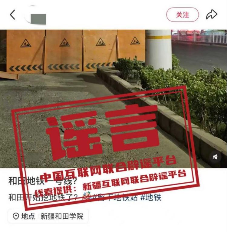 真相:近日,有網民發(fā)布消息稱“新疆和田要建地鐵一號線?開始挖地鐵了?”,并配以道路施工圖片,引發(fā)關注。經和田市交通運輸局核實,網傳信息系謠言,截至目前,未收到任何關于和田市開挖地鐵的工作通知或確認信息。(來源:“新疆網絡辟謠”微信公眾號)