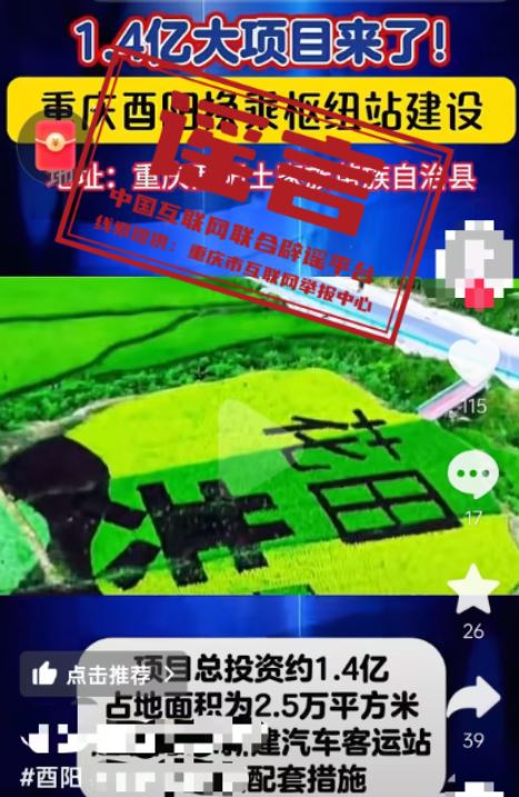 真相:近日,有網(wǎng)民發(fā)布信息稱“1.4億大項(xiàng)目來了,重慶酉陽換乘樞紐站建設(shè),新建汽車客運(yùn)站及相關(guān)配套”,引發(fā)關(guān)注。經(jīng)重慶市酉陽縣交通運(yùn)輸委核實(shí),酉陽縣正在推進(jìn)桃花源景區(qū)游客集散中心提升項(xiàng)目,暫無“1.4億建設(shè)換乘樞紐站”項(xiàng)目,網(wǎng)傳信息系謠言。(來源:“重慶辟謠”微信公眾號(hào))