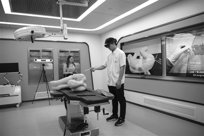 在位于安徽省蕪湖市的“中國視谷”,工作人員在模擬手術(shù)室里演示數(shù)字化手術(shù)輔助平臺。新華社發(fā)(肖本祥 攝)