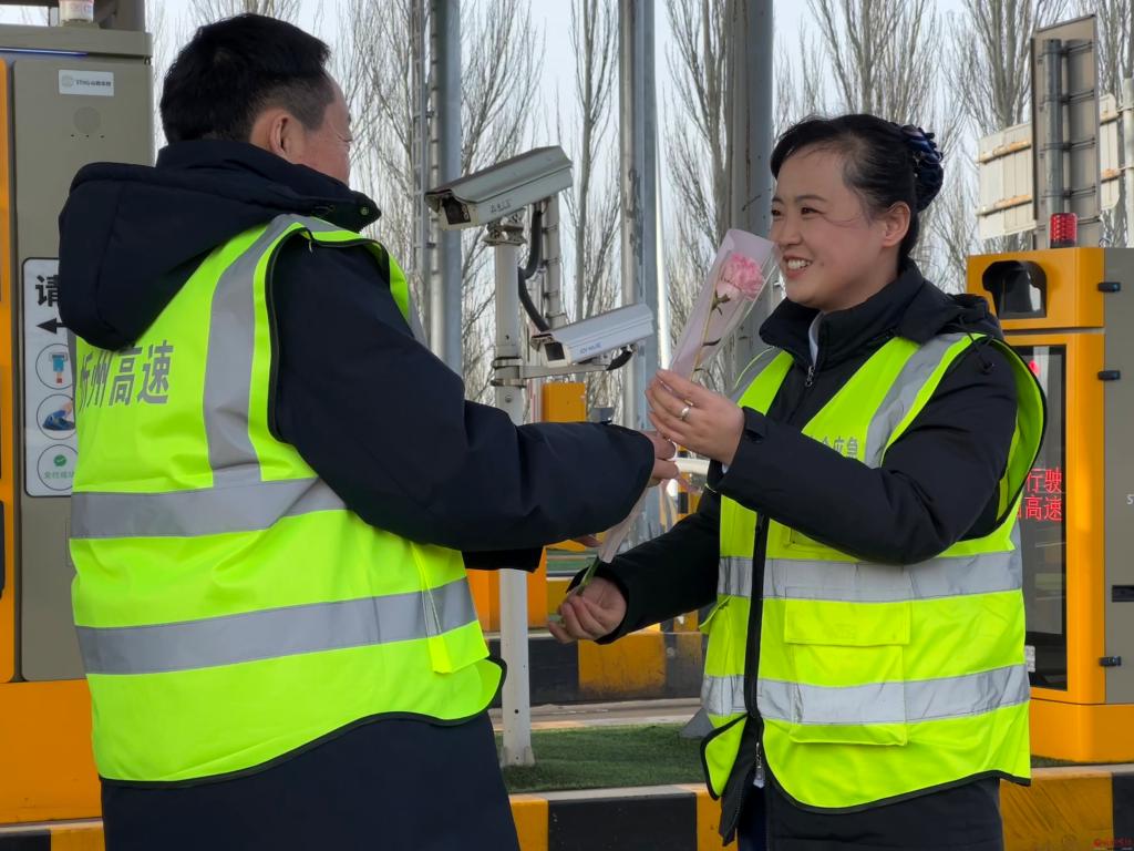晨光初綻,山西交控忻州公司新廣武收費(fèi)站的車道還浸潤著料峭春寒,新廣武收費(fèi)站黨支部書記、站長躬身向車道巡檢的女職工送上一束裹滿晨露的康乃馨鮮花,女職工接過花束時(shí),指尖觸碰的不僅是鮮嫩花瓣,更是一份并肩前行的溫度。春風(fēng)吹散她鬢角的碎發(fā),卻吹不散嘴角漾開的笑意——那是被看見、被珍視的感動,如同花瓣上顫動的露珠,折射出平凡崗位里的璀璨微光。
