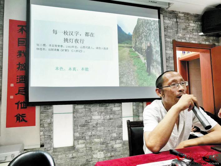 本報訊 8月15日晚,位于忻州市七一北路的好目匠眼鏡店迎來一場文學盛會。保德縣、岢嵐縣、五寨縣、原平市、定襄縣的詩歌愛好者,與忻州城區(qū)的詩歌愛好者一起聆聽了著名詩人張二棍關于詩歌創(chuàng)作的講座,甚至有詩歌愛好者專門從北京趕回忻州。當晚,連講座廳外都站滿了聆聽的人。