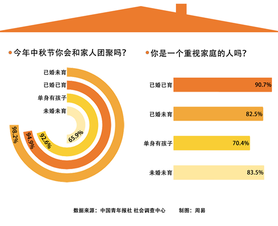 近日,中國(guó)青年報(bào)社社會(huì)調(diào)查中心通過問卷網(wǎng)(wenjuan.com),對(duì)1018名受訪者進(jìn)行的一項(xiàng)調(diào)查顯示,今年中秋節(jié),92.9%的受訪者會(huì)和家人團(tuán)聚。82.1%的受訪者把組建屬于自己的小家庭當(dāng)作人生中必須要做的事,88.2%的受訪者認(rèn)為自己是一個(gè)重視家庭的人。對(duì)于當(dāng)下熱播的家斗劇和離婚劇,46.3%的受訪者認(rèn)為反映了確實(shí)存在的家庭矛盾,43.1%的受訪者認(rèn)為過度強(qiáng)調(diào)矛盾,忽略了愛。