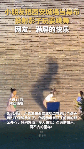 3個(gè)小朋友用燈把影子投射在城墻