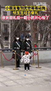 一名小朋友看到武警哥哥在站崗