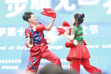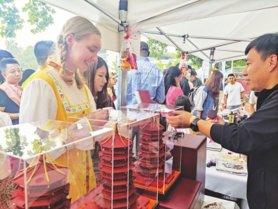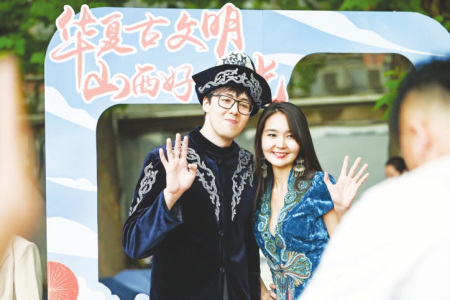 當日活動吸引了來自世界各地的3萬余名師生及社會各界人士。獨唱《人說山西好風光》《千年一塔》,舞蹈《醋之韻》《翼城花鼓》等贏得師生們熱烈掌聲。在五大洲文化展區(qū),絳州木版年畫傳承人吳百鎖現(xiàn)場印制木版年畫贈送師生,成為一道亮麗風景。廣靈剪紙、應縣木塔模型、黎侯虎、寧武毛健茶等吸引各國留學生駐足欣賞。“華夏古文明山西好風光”主題相框前,無數(shù)外國友人饒有興趣交流互動,拍照留念?!吧轿髟亍被鸨本┱Z言大學世界文化節(jié)。