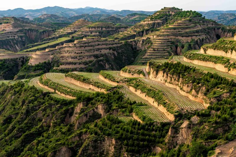 站在永和梯田觀景臺上,一壟壟地膜像一條條白色的絲帶,纏繞在層層疊疊的梯田間。連綿的山坡間、山塬上,鋪滿了綠色的盛裝——油松、連翹,還有地里的高粱苗,正孕育著無限的生機(jī)活力。