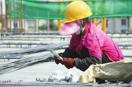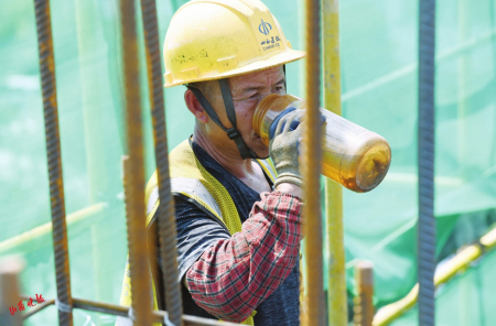 當(dāng)日,是入伏第一天,意味著開始進(jìn)入一年中最熱的時(shí)候。在熱火朝天的施工現(xiàn)場,工人師傅們埋頭苦干,他們雖然戴著自制遮陽帽、冰袖,身旁放著水壺,但一小會(huì)兒工夫就會(huì)汗流浹背?!斑@樣的杯子,我每天要喝好幾杯水?!碧鞖馓珶幔瑏碜运拇飞降牧钟驯永锏乃伙嫸M。黝黑的皮膚、如雨的汗水、潮濕的后背……當(dāng)大多數(shù)人避暑納涼時(shí),不少勞動(dòng)者卻辛勤地?fù)]灑著汗水,堅(jiān)守在施工一線。在這個(gè)工地上,有很多和林英一樣的打工人,他們來自全國各地,用青春和汗水建設(shè)美麗山西。