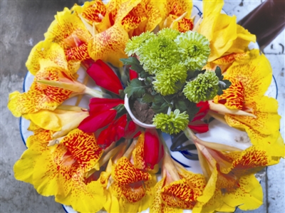 他的菜攤與眾不同,擺著五顏六色的鮮花:青菜配美人蕉、芹菜配梔子花、空心菜配菊花、香蔥配紅花……他穿著西裝、打著領(lǐng)帶賣菜,面對(duì)顧客,總是樂(lè)呵呵的。他的樂(lè)觀感動(dòng)了很多人,生意因此火爆。