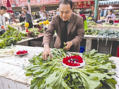 “那時(shí)孩子在成都理工大學(xué)上學(xué),家里經(jīng)濟(jì)壓力很大?!?年前,王美成接替妻子開(kāi)始在城區(qū)賣菜,他發(fā)現(xiàn)有時(shí)菜并不好賣?!坝幸淮挝胰ゾ频陞⒓友鐣?huì),看到酒店里有的菜品裝飾挺好看,我就想是不是也可以把花裝飾在菜攤上。嘗試之后發(fā)現(xiàn)效果挺好,大家都喜歡?!?/span>