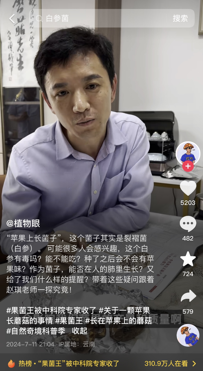 將蘋果長蘑菇跟網友長知識連接起來的,是涉事科研人員有料且有趣的科普。他們來得正是時候的科普,讓此事在“長菌蘋果”自帶的獵奇色彩和“千里求菌”的戲劇性之外,多了些社會價值:在他們順勢科普前,“長菌蘋果”留給網友的就是個“果菌王”的網梗;在他們展開科普后,“長菌蘋果”讓很多網友頭一次知道了“裂褶菌(又叫白參)”的存在。