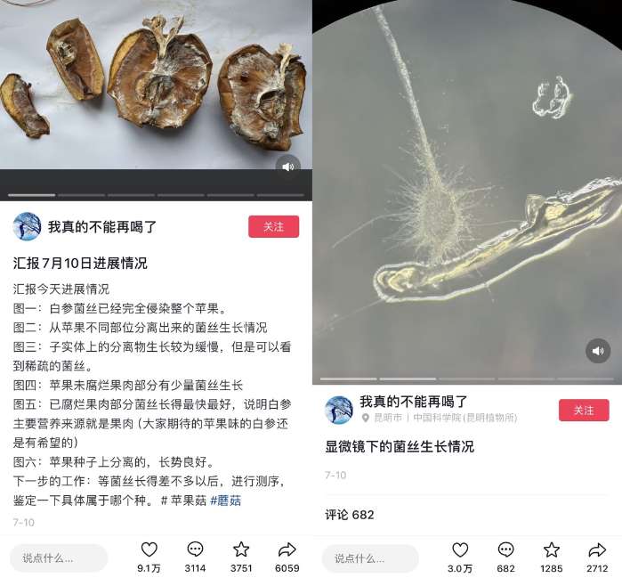 拿到樣本后,許博士對蘋果做了切片觀察,還在抖音上向網友實時更新起了菌絲生長情況,引發(fā)越來越多網友的“追更”。之后又有科普創(chuàng)作者@植物眼 專門采訪許博士的導師趙琪,他的細致講解讓很多網友紛紛表示“又學到了新知識”。