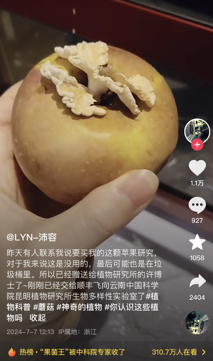 一顆“長菌蘋果”的奇幻漂流,引發(fā)了媒體聚焦。據潮新聞報道,上個月末,浙江梅雨不斷。浙江德清的鄧小姐發(fā)現,家里放了一個多月的蘋果上,竟長出了白色的蘑菇。她在抖音上曬出圖片,登上抖音熱榜,那顆“長菌蘋果”被網友戲稱為“果菌王”。
