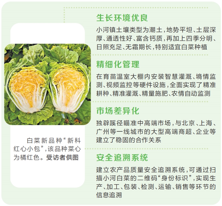 “好的品種培育是種出優(yōu)質(zhì)小河白菜的第一步,科學(xué)育苗則是最為關(guān)鍵的一環(huán)。”張躍民介紹,小河白菜賣得貴又賣得好的另一個(gè)重要原因是精細(xì)化管理——通過(guò)在育苗溫室大棚內(nèi)安裝智慧灌溉、墑情監(jiān)測(cè)、視頻監(jiān)控等硬件設(shè)施,全面實(shí)現(xiàn)了精準(zhǔn)耕種、精準(zhǔn)灌溉、精量施肥、農(nóng)情自動(dòng)監(jiān)測(cè),進(jìn)而避免白菜干燒心的發(fā)生,提高白菜的產(chǎn)量和品質(zhì)。另外,新鄉(xiāng)市農(nóng)科院大白菜育種團(tuán)隊(duì)也會(huì)對(duì)白菜種植管理提供創(chuàng)新技術(shù)服務(wù),讓公司通過(guò)更新品種、科學(xué)管理,從而增加收入。