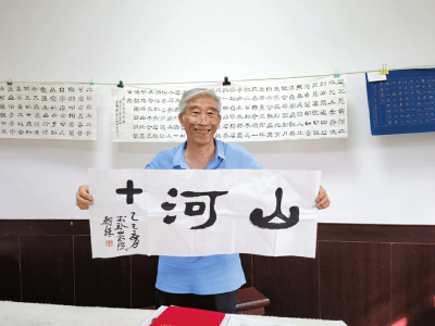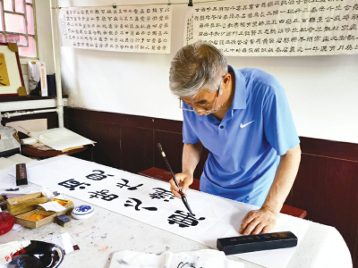 交城卦山書院有“山西姥爺”王朝珠的工作室,在墨香與花香中,山西晚報(bào)記者講起“山河+”客戶端的發(fā)展,說(shuō)起2004年其兄長(zhǎng)王朝瑞先生贈(zèng)送墨寶的來(lái)歷,王朝珠老先生感嘆這份情意和緣分,便揮毫潑墨,接連寫下書法作品饋贈(zèng)山西晚報(bào)。特別是在“山河+鄰聚里”隸書中,加蓋了剛剛制印好的“山西姥爺”篆書印章,告訴記者“這枚印章還是第一次啟用咧?!?/p>
