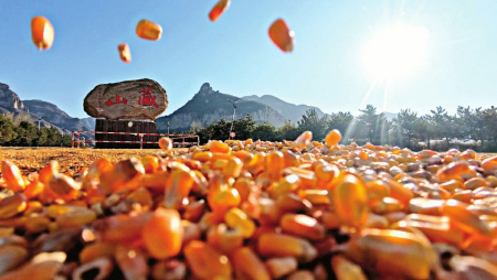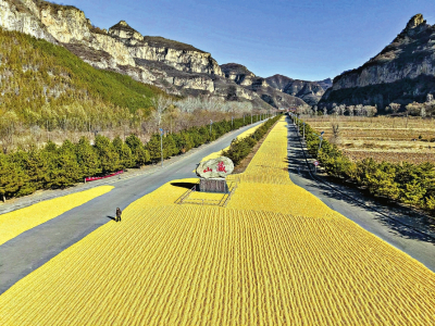 從空中俯瞰,景區(qū)標(biāo)志性的刻有“藏山”字樣的巨石,被連片的玉米“花?!杯h(huán)繞,綿延千米的道路上,玉米粒被村民們精心鋪成整齊的波紋狀,宛如一條流淌的金色長河?!敖衲昃皡^(qū)把這么寬的路讓給我們晾曬糧食,真的解決了我們一大難題!”正在翻曬玉米的村民李師傅說道。