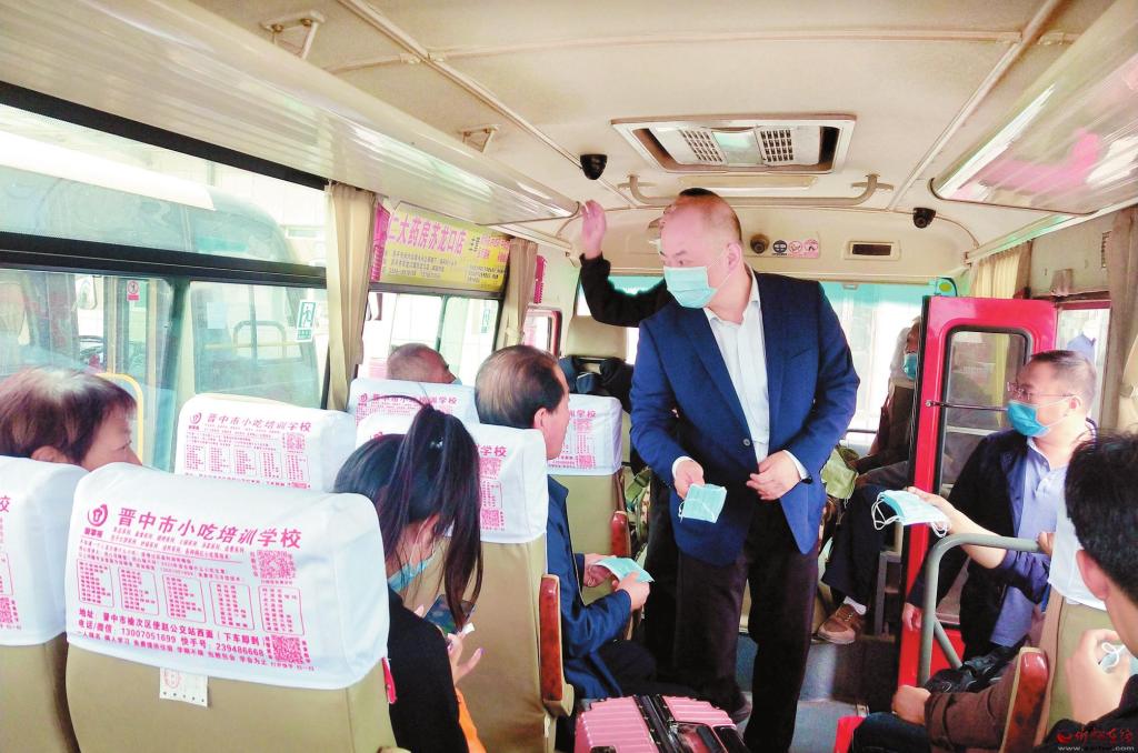 原平市交通運輸局加強對交通運輸企業(yè)、“兩客一危一貨”、旅游包車、網(wǎng)絡(luò)包車和重點路段的監(jiān)督檢查,嚴厲打擊“三超一疲勞”、非法載客、超員超限、疲勞駕駛和違規(guī)冒險行車等違法違規(guī)行為。在抓安全的同時,將疫情防控常態(tài)化,強調(diào)汽車站工作人員必須做好登記工作,督促乘客佩戴口罩。圖為工作人員在客車上為旅客發(fā)放口罩。( 劉建春 攝)