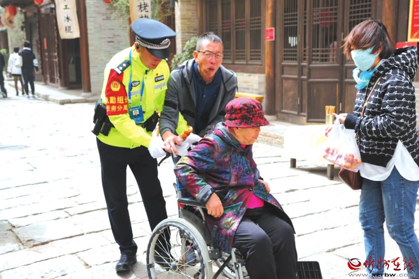 “節(jié)假日期間,古城游客量很大,在這種情況下我們越要擰緊安保這根弦,保證萬無一失!”老解說著,遞過手機(jī),指著上面的圖片說,“今天有6個(gè)孩子與家人走失,我們各巡區(qū)聯(lián)動(dòng)已經(jīng)幫他們找到親人。咱們這工作效率和愛民情懷,老百姓的滿意度能不高嘛?哈哈哈——”這時(shí)一通求助電話打來,原來是執(zhí)勤民警撿到一只卡包,民警通過多方聯(lián)系終于聯(lián)系上了失主,失主已經(jīng)來到古城取他們丟失的東西。記者在移動(dòng)警務(wù)室見到了失主,一家三口滿頭大汗登上警務(wù)室,從民警手中拿過已經(jīng)找了無數(shù)遍的卡包,感激不盡:“謝謝你們。這包里有好幾張社???、銀行卡,還有身份證等等,一旦丟了造成多大麻煩啊。”這時(shí)記者看到移動(dòng)警務(wù)室的墻上有個(gè)“便民服務(wù)欄”,上面掛著游人丟失了但還沒有取走的身份證以及其他物品。最顯眼的是這里有兩個(gè)便民服務(wù)醫(yī)藥箱,里面有速效救心丸、藿香正氣口服液、華佗紫草燙傷膏、消毒棉片和創(chuàng)可貼、體溫計(jì)等,民警說一旦游客出了狀況,這些東西就派上用場了。