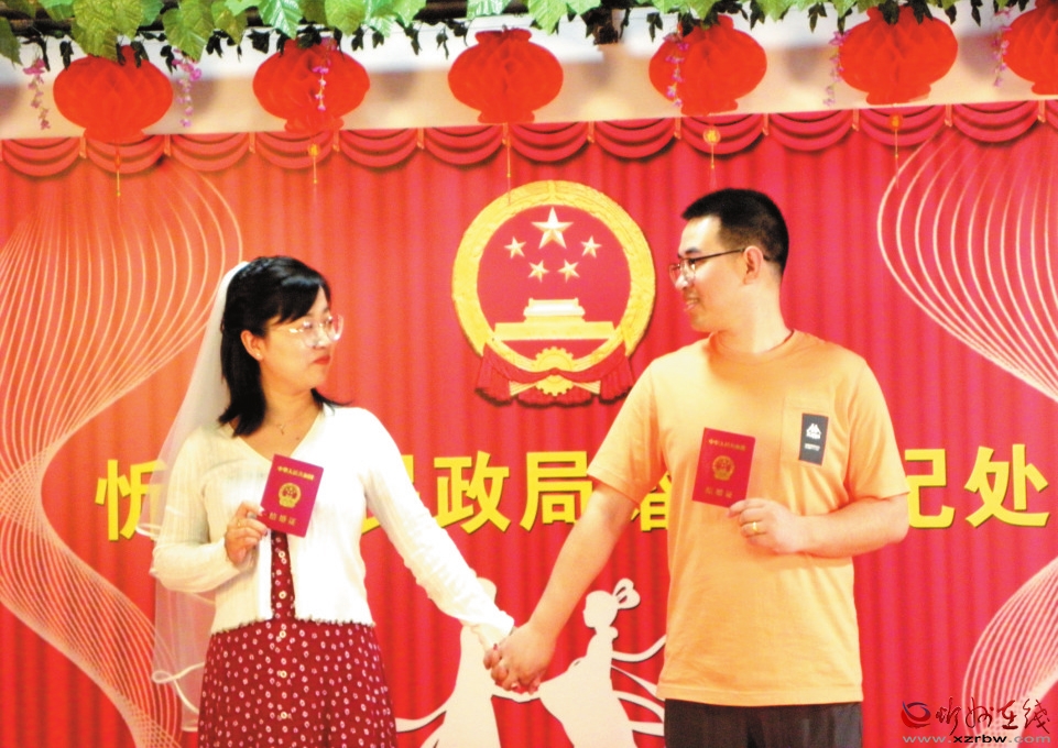 在頒證儀式上,登記員帶領新人宣讀結婚誓言。忻州市婦聯、市民政局相關領導為新人送上溫馨祝福。在忻府區(qū)民政局婚姻登記服務中心,新人們臉上洋溢著幸福的笑容,來到婚姻登記窗口依次辦理結婚手續(xù)。