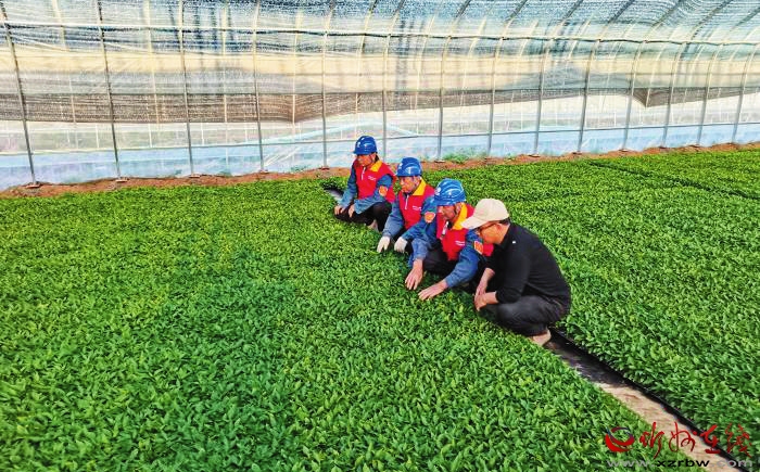 供電人員在大棚內(nèi)了解椒農(nóng)的用電需求。