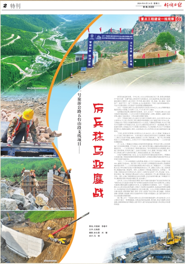 搶抓建設(shè)黃金期,刷新項(xiàng)目進(jìn)度條。近日,在太行一號(hào)旅游公路五臺(tái)山段支線(xiàn)項(xiàng)目建設(shè)現(xiàn)場(chǎng),工人們正有條不紊地加緊施工,挖機(jī)、裝載機(jī)、運(yùn)輸車(chē)來(lái)回穿梭,建設(shè)工地呈現(xiàn)出一片熱火朝天的繁忙景象。
