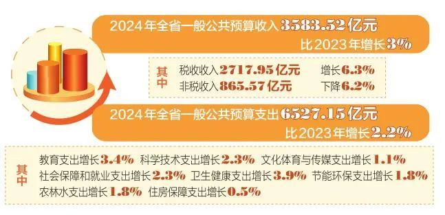 收支管理是財政工作的核心。按照政府預算報告,2024年全省一般公共預算收入3583.52億元,比2023年增長3%。其中,稅收收入2717.95億元,增長6.3%;非稅收入865.57億元,下降6.2%。全省一般公共預算支出6527.15億元,比2023年增長2.2%。其中,教育支出增長3.4%,科學技術支出增長2.3%,文化體育與傳媒支出增長1.1%,社會保障和就業(yè)支出增長2.3%,衛(wèi)生健康支出增長3.9%,節(jié)能環(huán)保支出增長1.8%,農(nóng)林水支出增長1.8%,住房保障支出增長0.5%。