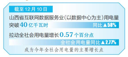 本報訊(記者杜鵑 通訊員張一龍)日前,國網(wǎng)山西省電力公司經(jīng)濟技術研究院發(fā)布了《山西省電力算力協(xié)同發(fā)展研究報告》,報告顯示,截至12月10日,山西省互聯(lián)網(wǎng)數(shù)據(jù)服務業(yè)(以數(shù)據(jù)中心為主)用電量突破40億千瓦時,同比增長58%,拉動全社會用電量增長0.57個百分點(全社會用電量同比增長2.77%),成為今年全社會用電量的主要增長點。