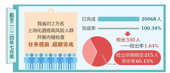 截至2024年7月底,對(duì)2萬名上消化道癌高風(fēng)險(xiǎn)人群開展內(nèi)鏡檢查任務(wù)提前、超額完成。全省2萬名篩查任務(wù),已完成20068人,完成率100.34%;檢出330人,檢出率1.64%;檢出早期病變215人,早診率65.15%。