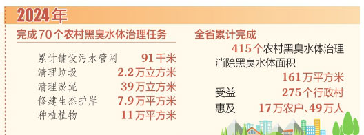 我省對農(nóng)村生態(tài)環(huán)境治理工作高度重視,2024年政府工作報告提出,要“完成50個農(nóng)村黑臭水體治理任務(wù)”。一年來,我省各級各部門積極投入力量,挖掘打通資源,用心用情用力辦好這一民生實事。生態(tài)環(huán)境部門更是自加壓力,完成了70個農(nóng)村黑臭水體治理任務(wù),累計鋪設(shè)污水管網(wǎng)91千米,清理垃圾2.2萬立方米,清理淤泥39萬立方米,修建生態(tài)護(hù)岸7.9萬平方米,種植植物11萬平方米,促進(jìn)重點(diǎn)關(guān)注水體所在村莊生態(tài)環(huán)境質(zhì)量明顯改善,并以標(biāo)志性成果讓農(nóng)民群眾對治理效果可感可及,真正讓農(nóng)村黑臭水體治理工程成為普惠的民生工程。