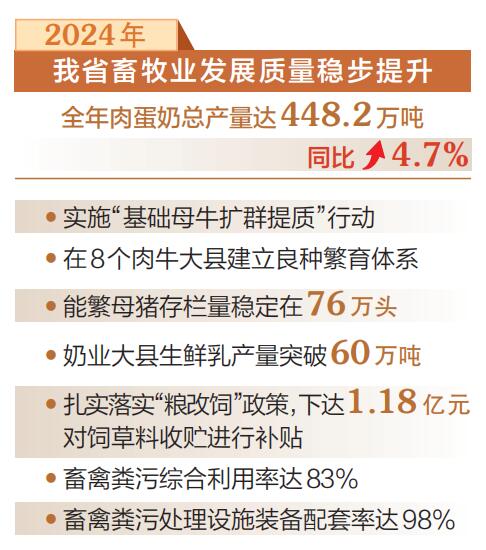 2024年,我省努力克服畜產(chǎn)品市場價(jià)格下行等不利因素,有力紓解產(chǎn)業(yè)困難,有效破解被動(dòng)局面。扎實(shí)落實(shí)“糧改飼”政策,下達(dá)1.18億元對(duì)飼草料收貯進(jìn)行補(bǔ)貼。出臺(tái)生鮮乳購銷合同補(bǔ)貼、肉牛奶牛貸款貼息、奶企辦乳制品加工補(bǔ)貼等8條政策,全力幫助養(yǎng)殖場戶紓困,穩(wěn)定肉牛奶牛生產(chǎn)。同時(shí),優(yōu)化生豬產(chǎn)能調(diào)控機(jī)制,生豬養(yǎng)殖扭虧為盈。