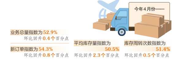 業(yè)務總量指數與新訂單指數雙回升。4月份,業(yè)務總量指數為52.9%,環(huán)比回升0.4個百分點;新訂單指數為54.3%,環(huán)比回升0.8個百分點。顯示出物流行業(yè)規(guī)模在擴張區(qū)間,業(yè)務總量指數、新訂單指數均保持增長態(tài)勢,經濟延續(xù)回升態(tài)勢不變,物流市場需求繼續(xù)釋放。