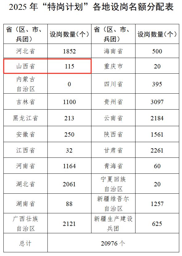 近日,教育部辦公廳、財政部辦公廳聯(lián)合印發(fā)《關于做好2025年農(nóng)村義務教育階段學校教師特設崗位計劃實施工作的通知》,全國計劃招聘特崗教師2萬名,其中山西計劃招聘115名。