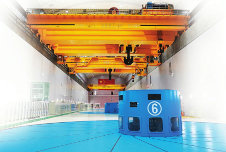 踏入這座智能化水平位居世界前列的水電站主廠房,映入眼簾的是震撼的工業(yè)圖景,耳中持續(xù)回響側(cè)排電箱發(fā)出的規(guī)律嗡鳴。廠房上空數(shù)十米處,太重研制的兩臺(tái)1000t橋式起重機(jī)正有條不紊地吊起巨大構(gòu)件緩緩掠過(guò)高空,精準(zhǔn)地運(yùn)往指定地點(diǎn)。沒(méi)有想象中的劇烈震顫與遲緩操作,所有動(dòng)作都流暢而精準(zhǔn),令人贊嘆。