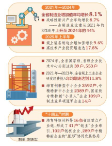 統(tǒng)計數(shù)據(jù)顯示,2021年—2024年,全省制造業(yè)增加值年均增長8.1%,戰(zhàn)略性新興產(chǎn)業(yè)年均增長8.7%,占制造業(yè)比重從2021年的32%逐年上升至2024年的44%。2025年上半年全省規(guī)上裝備制造業(yè)增加值增長9.6%,高技術產(chǎn)業(yè)投資增速達17.8%,戰(zhàn)略性新興產(chǎn)業(yè)對工業(yè)增長貢獻率日漸提高。