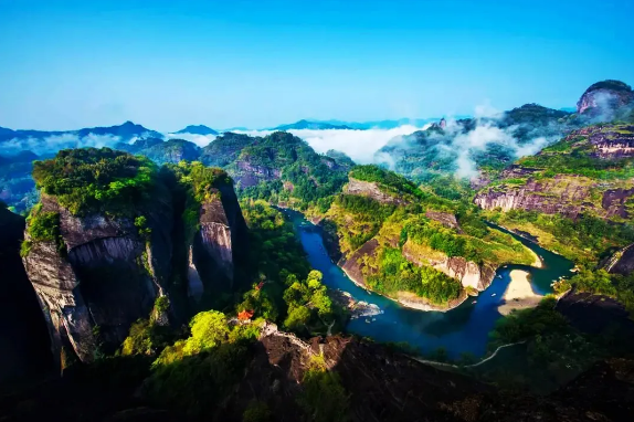 武夷山是三教名山,素有“奇秀甲東南”之美譽(yù),最高峰黃崗山海拔2158米,為東南第一峰,號(hào)稱“華東屋脊”。倘登高俯視,云興霞蔚,那九曲溪流、三十六峰、七十二洞、九十九巖的山水奇境,令人目不暇接,嘖嘖稱奇。五臺(tái)山是世界佛教名山,享有“清涼圣境”之美譽(yù),最高峰葉斗峰海拔3061米,為華北第一峰,號(hào)稱“華北屋脊”。若置身臺(tái)巔,東臺(tái)能看云海日出,西臺(tái)能賞清風(fēng)明月,南臺(tái)能觀爛漫山花,北臺(tái)能望無垢瑞雪,中臺(tái)可攬星辰萬象,一時(shí)恍若仙境,不由得馳思遐想。
